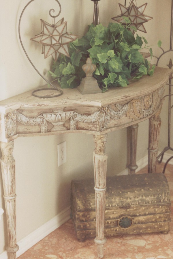Layered, distressed, and glazed table